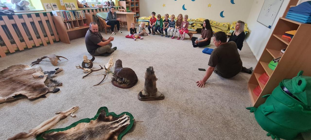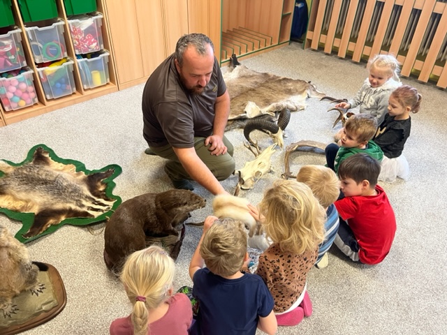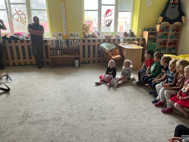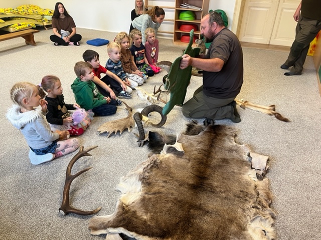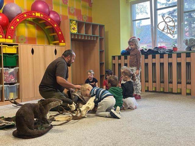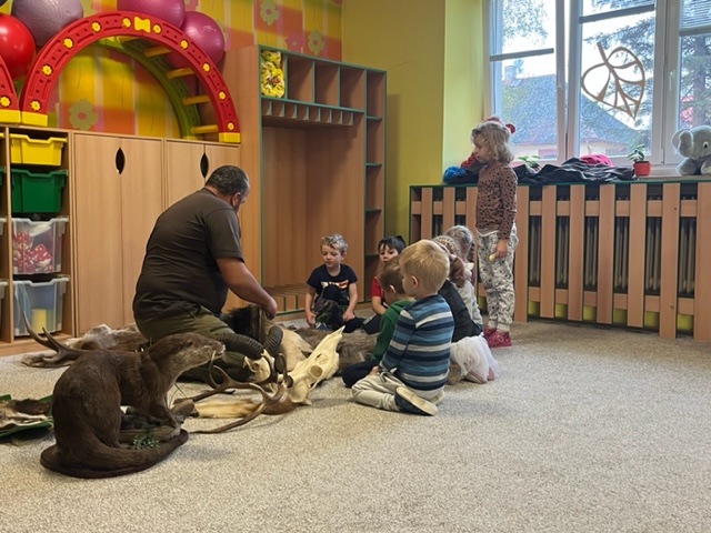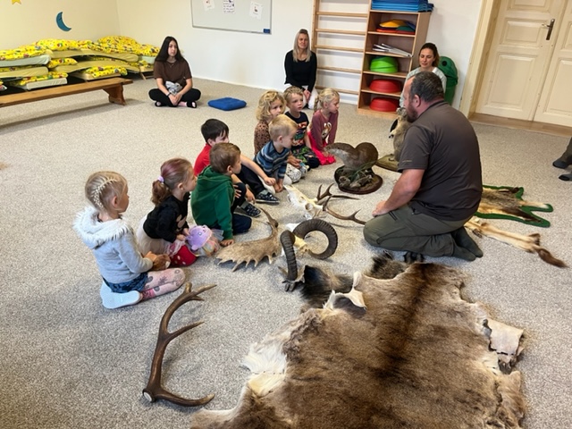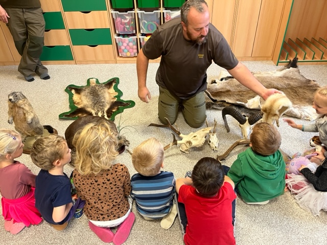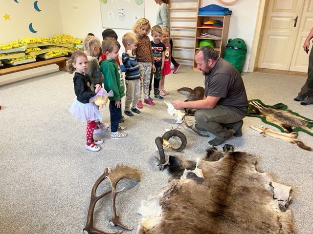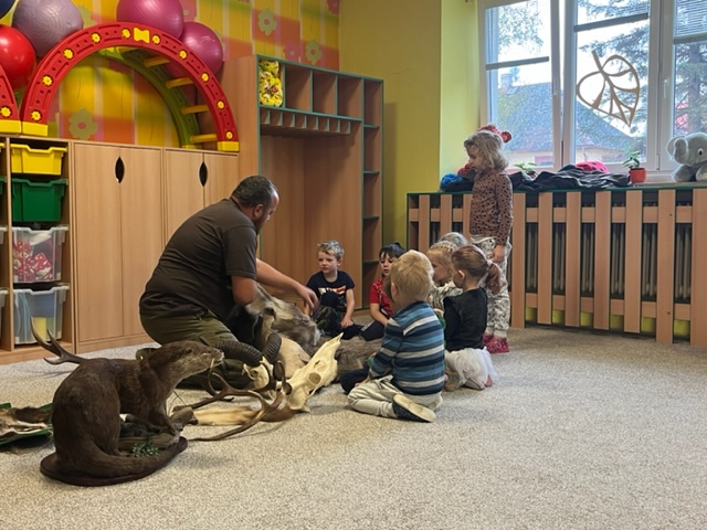 V rámci tématu jsme si do školky pozvali lesníky. Děti se dozvěděly spoustu informací o životě v lese, měly i názornou ukázku v podobě vycpaných zvířat, srstí...